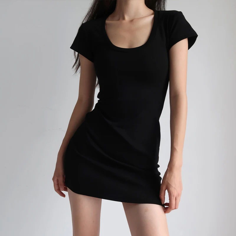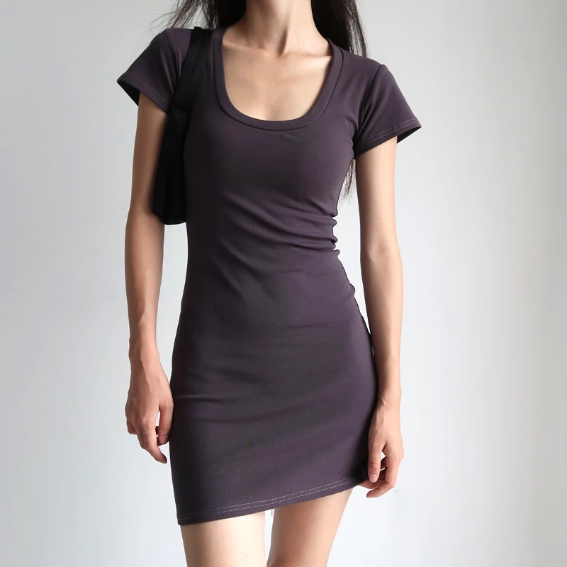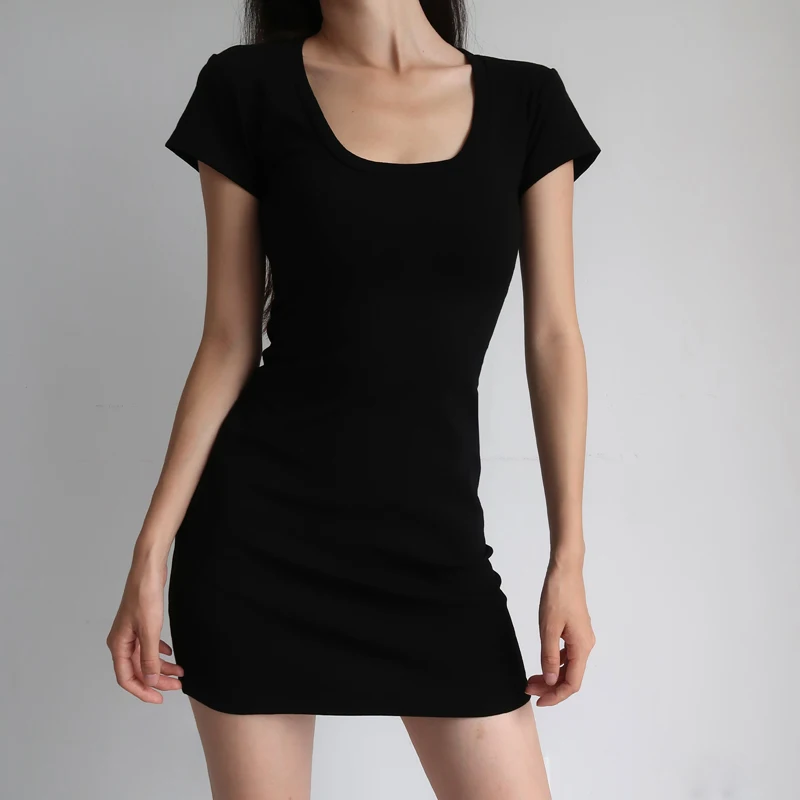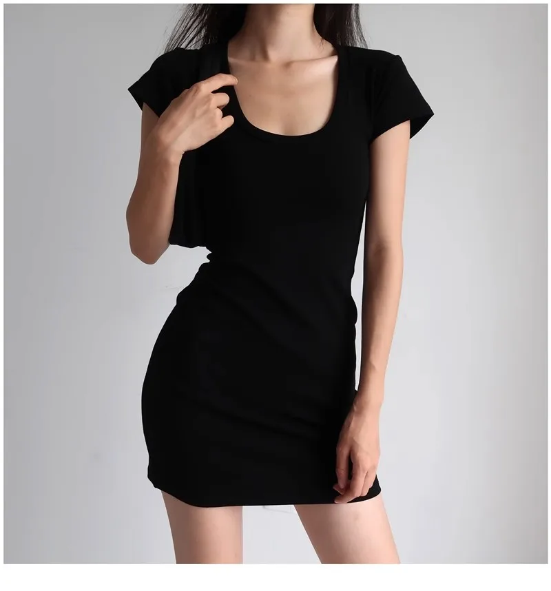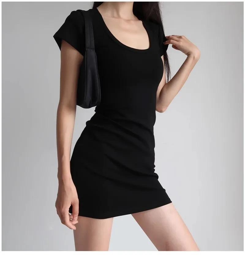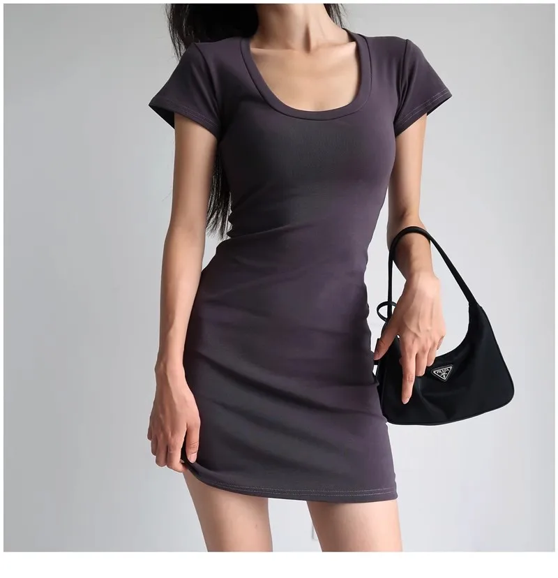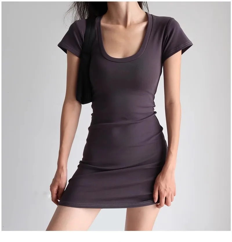 American Retro Slim Fit Dress Summer New High Waisted Short Sleeved Dress Women Fashion Solid Color Mini Dress