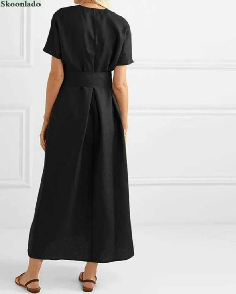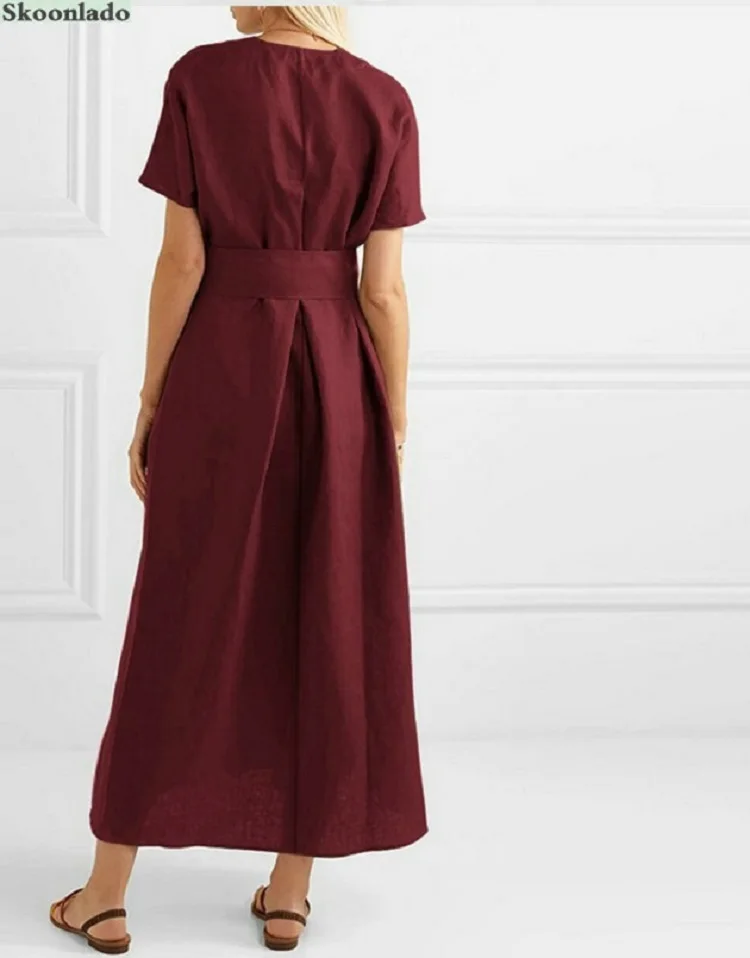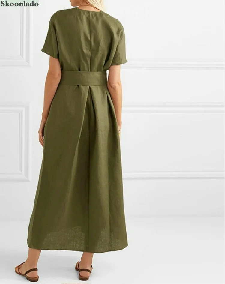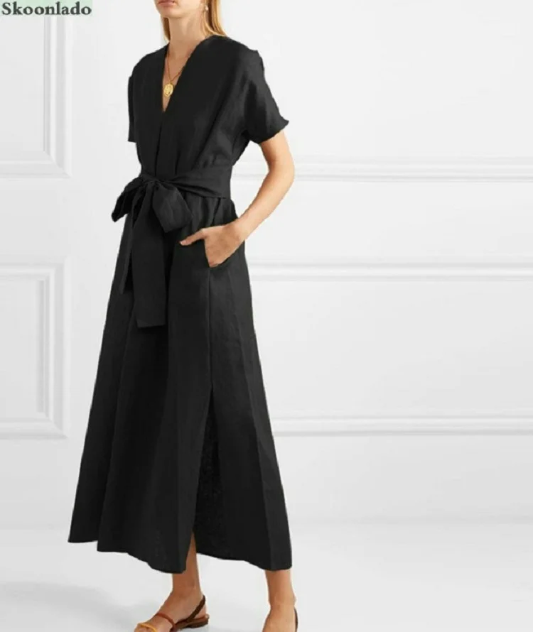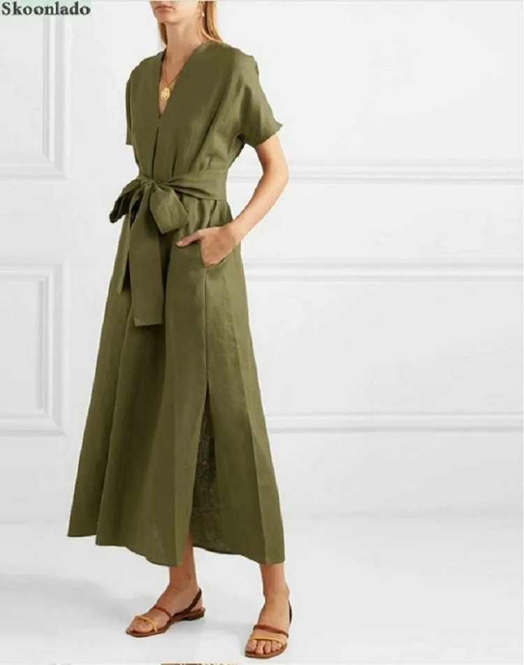 Overseas Sizes All Women Summer Cotton Linen Long Dresses Good Quality Elegant Classic Female Linen Dress Belt Cotton Clothes